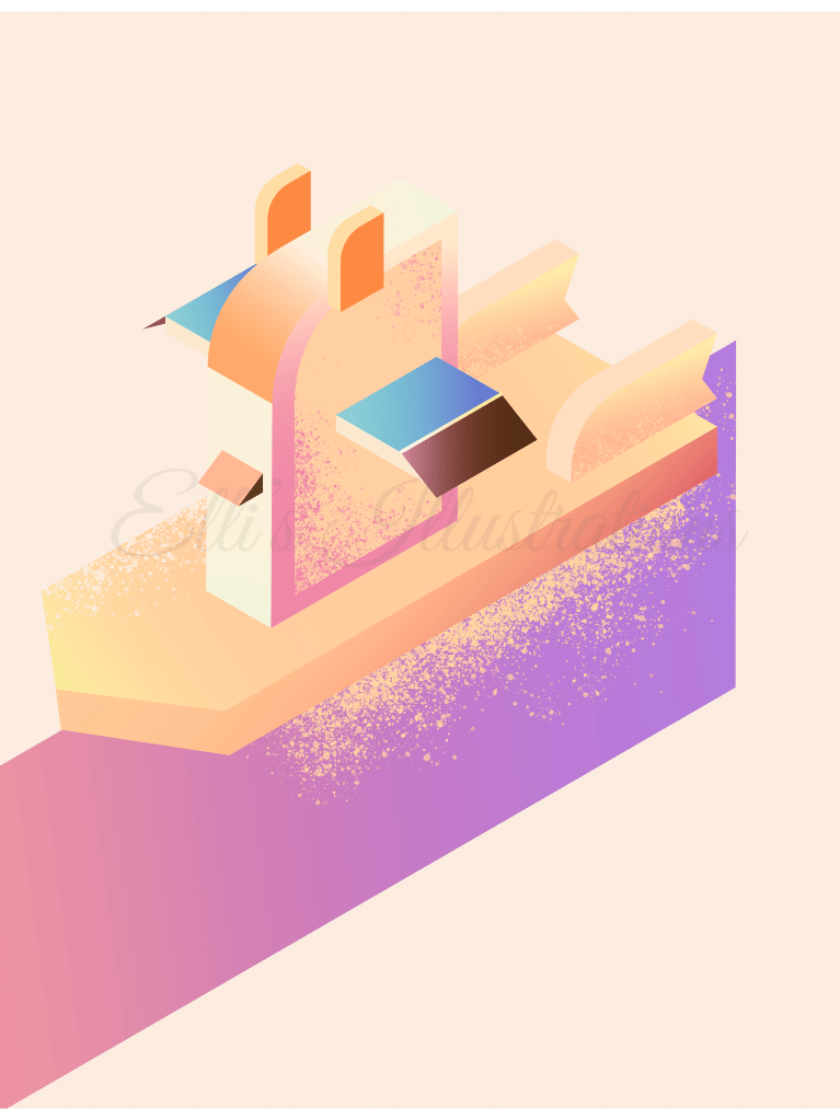 This is another publishing illustration of a mysterious character in isometric style but not a boat! It is like a small spaceship mystery character, that looks like a penguin or some flying toy ‘extraordinaire’. It is great to add another isometric style with simple design and to elaborate more by adding some textures.